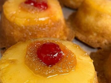 A burst of tropical flavor in each bite, with caramelized pineapple atop a moist pineapple cake, crowned with a cherry.
